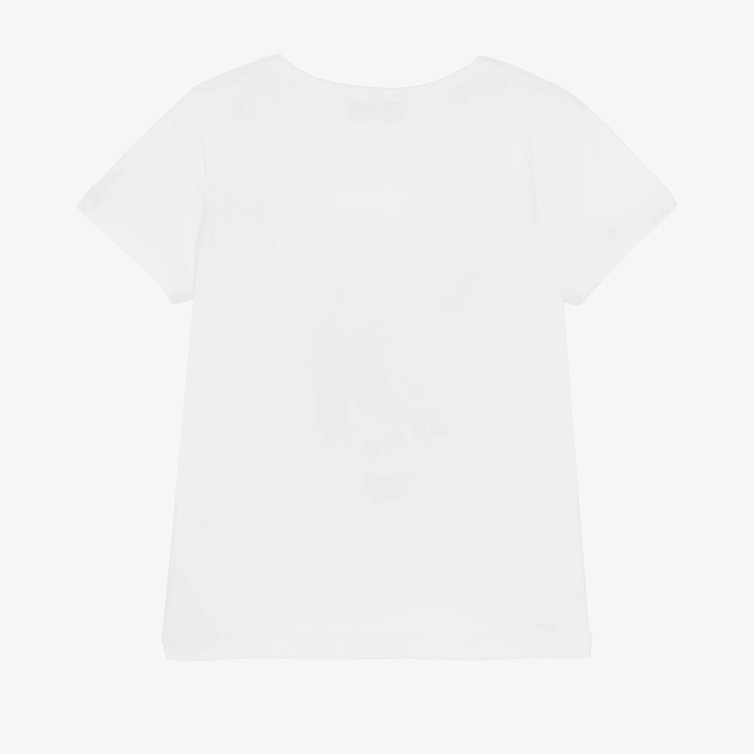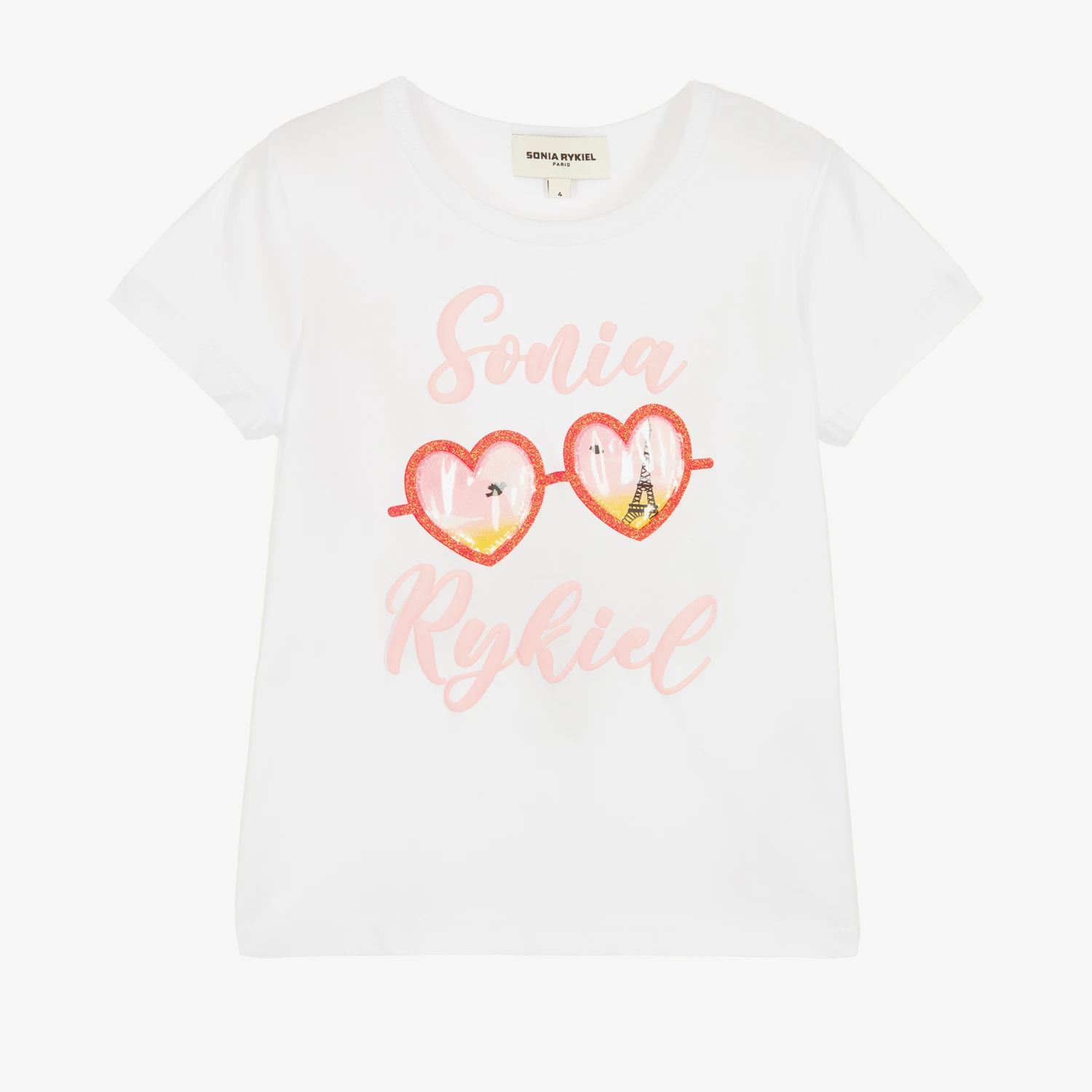 Designed by Sonia Rykiel Paris, this white T-shirt for girls is made in soft cotton jersey. The front is printed with the brand’s logo in pink, paired with sparkly pink sunglasses with a cool Eiffel Tower motif. Comfortable and versatile, it has a relaxed crew neckline and has capped sleeves.