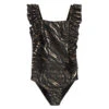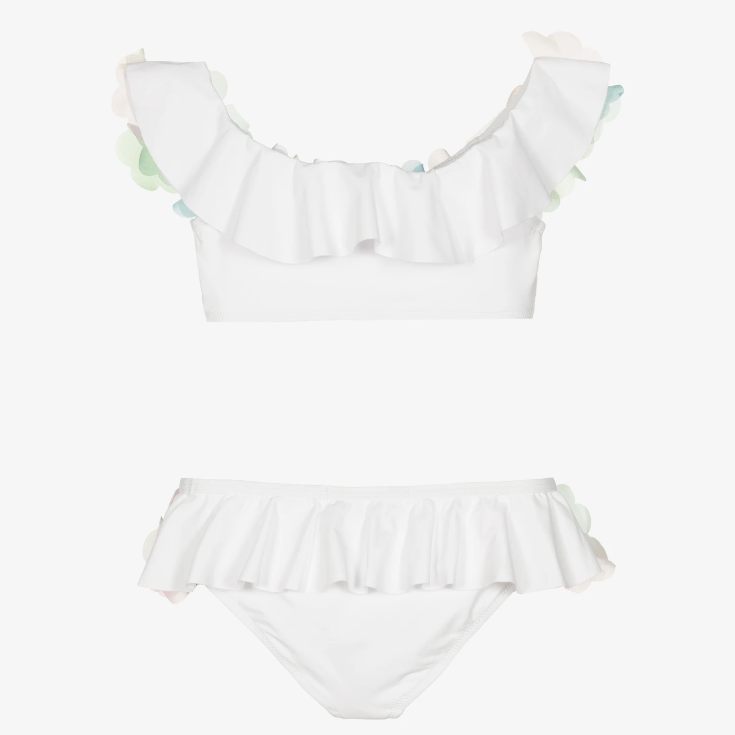 A gorgeous white bikini for girls by Stella Cove. In an elegant off-the-shoulder style, it is trimmed with fluttery chiffon petals in green, blue and pink. This stretchy bikini is both stylish and comfortable with a soft lining.