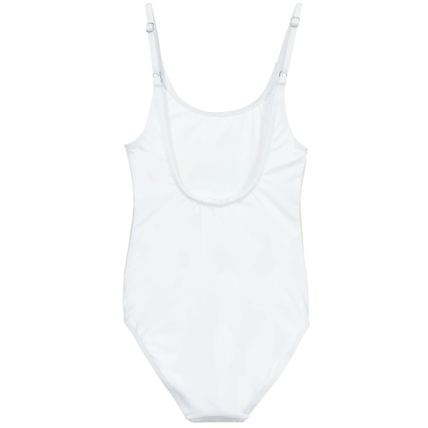 Girls white swimsuit by designer Stella Cove, with a pink and green tie dye heart motif. Soft and stretchy, it has a lightweight lining for added comfort. There is a low back and thin adjustable straps, for the perfect fit.