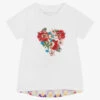 Ivory long sleeved top for girls by Stella McCartney Kids, made in soft organic cotton jersey. With fun contrasting pink and yellow sleeves, it has an inspiring ‘Smile and Be Happy’ printed on the front with bold shapes and vibrant colours.