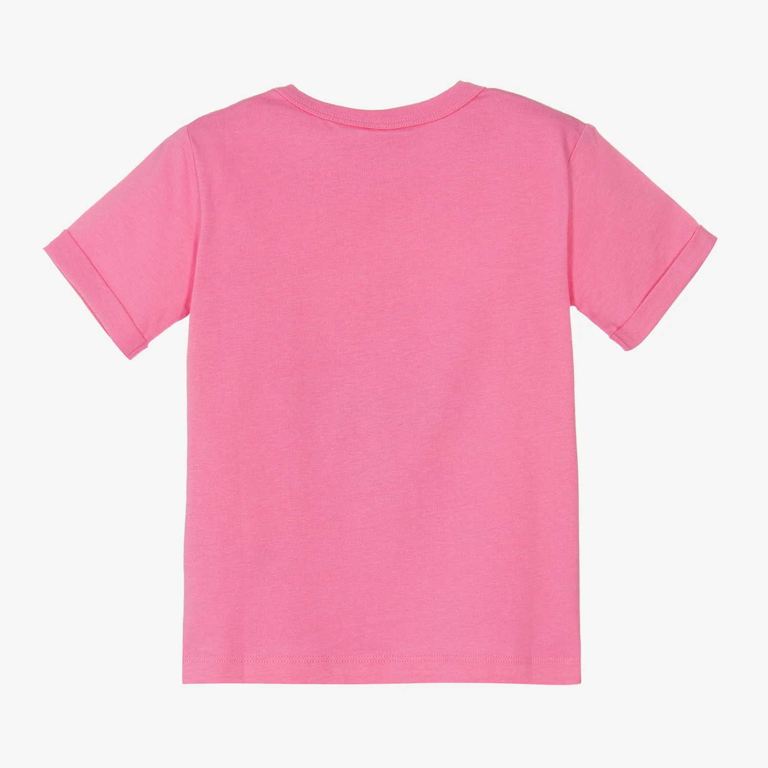 Girls pink organic cotton T-shirt from Stella McCartney Kids, made in soft and lightweight jersey. A colourful vinyl star appliqué decorates the front, with cool green and pink fringing beneath for a bohemian look. This casual crew neck piece has turned-up sleeve cuffs.
