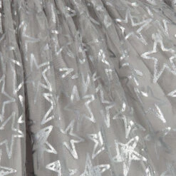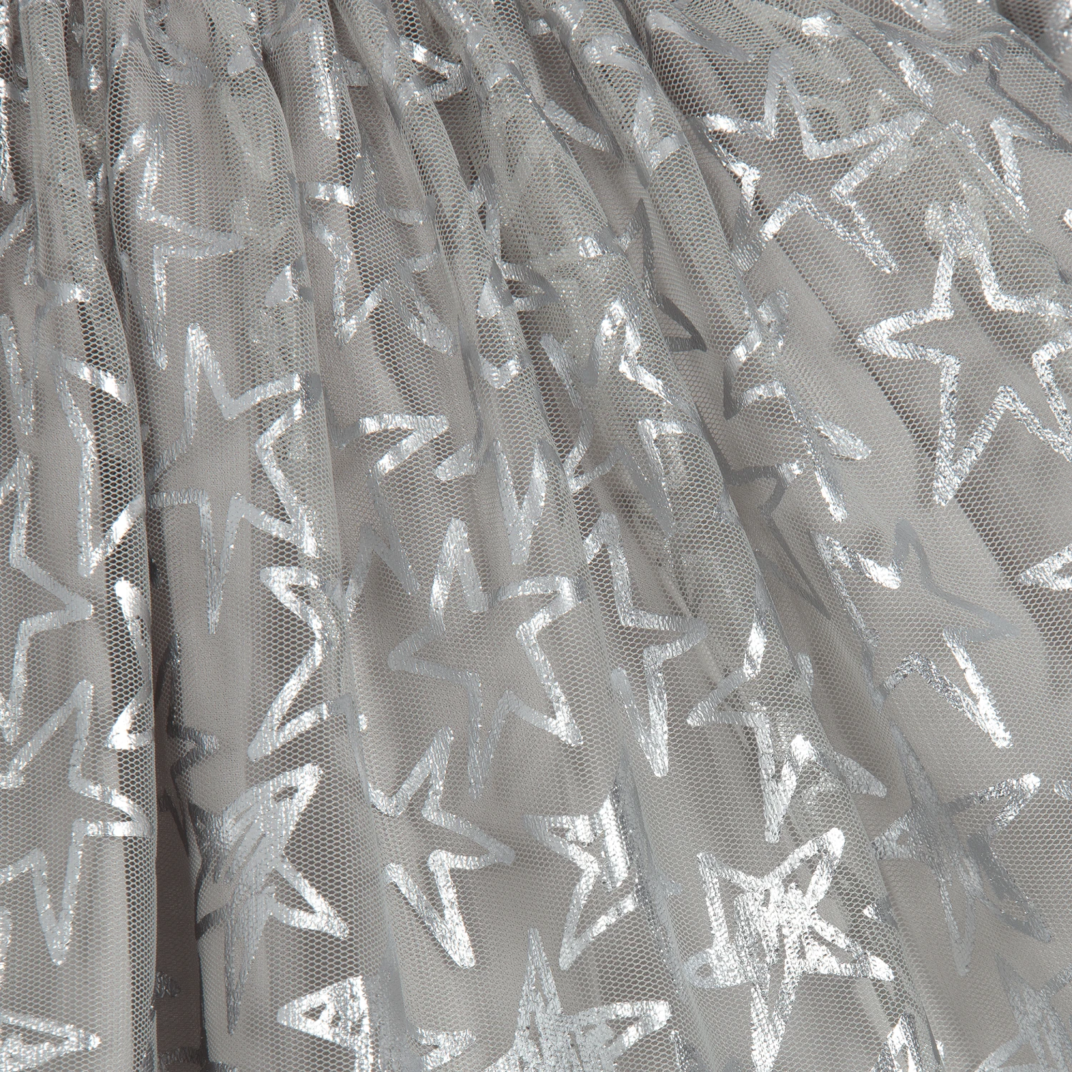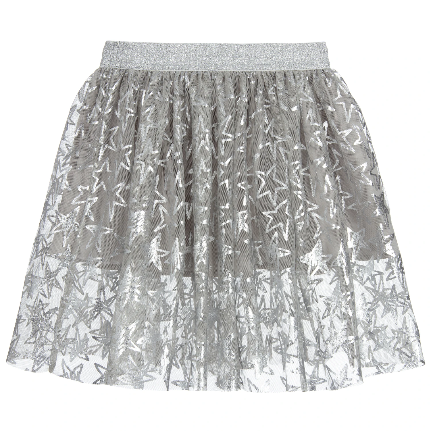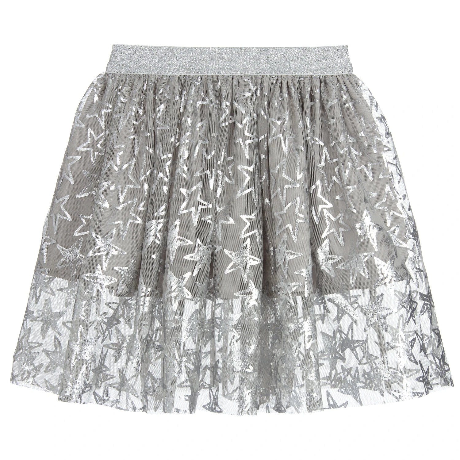 Girls skirt by Stella McCartney Kids, with shiny silver stars on grey tulle and a glittery silver elasticated waistband. The short under-skirt is made in comfortable cotton fabric, with the longer tulle overlay creating a pretty see-through hemline.