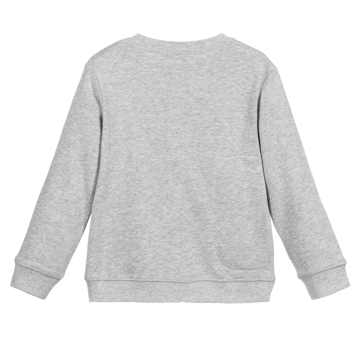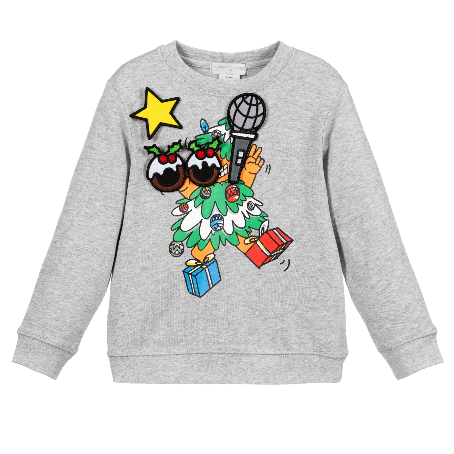 A grey sweatshirt for boys and girls by Stella McCartney Kids. It is made from a mid-weight cotton jersey with a soft fleecy inside. It comes with three fun badges which can be attached with velcro tabs to the colourful Christmas tree print on the front.