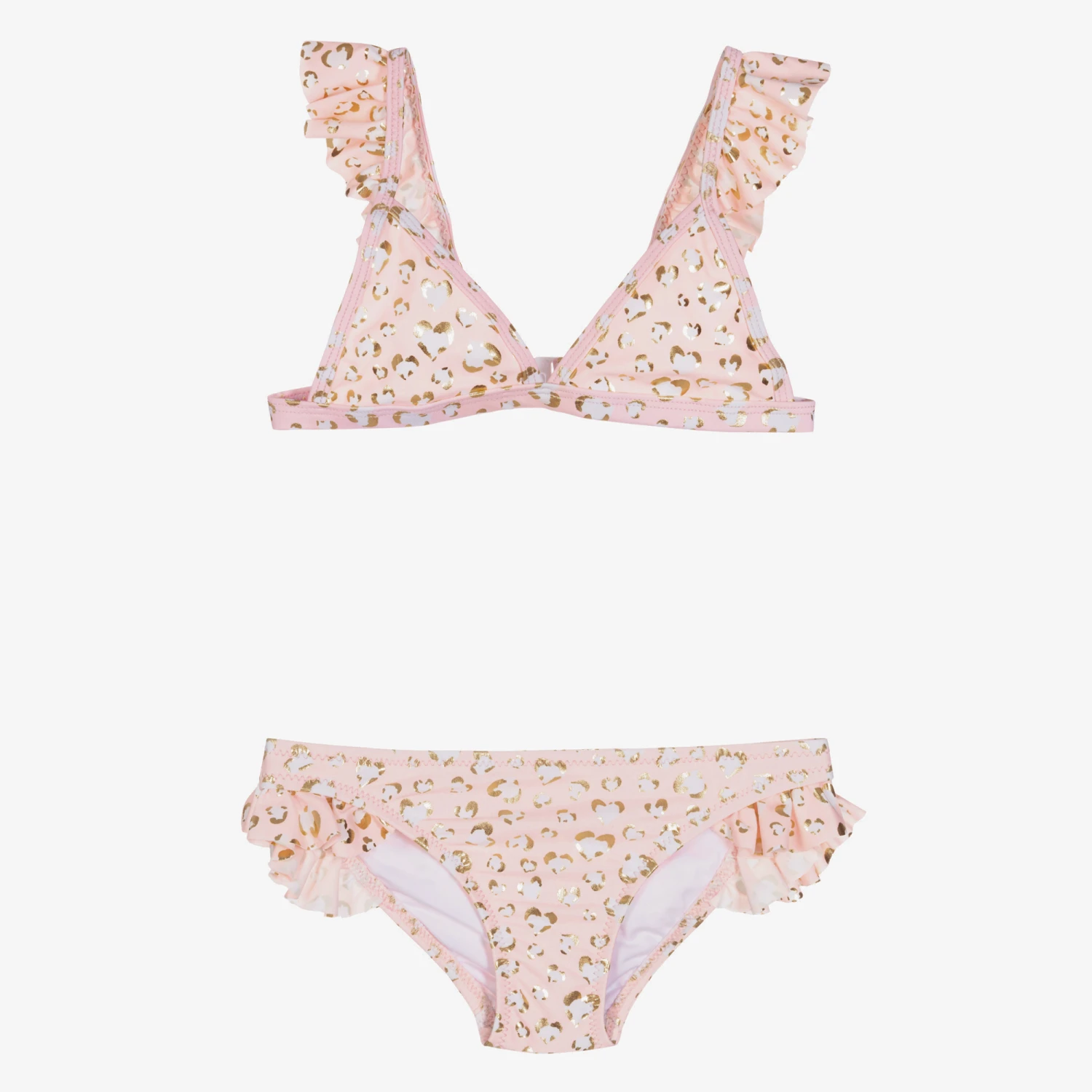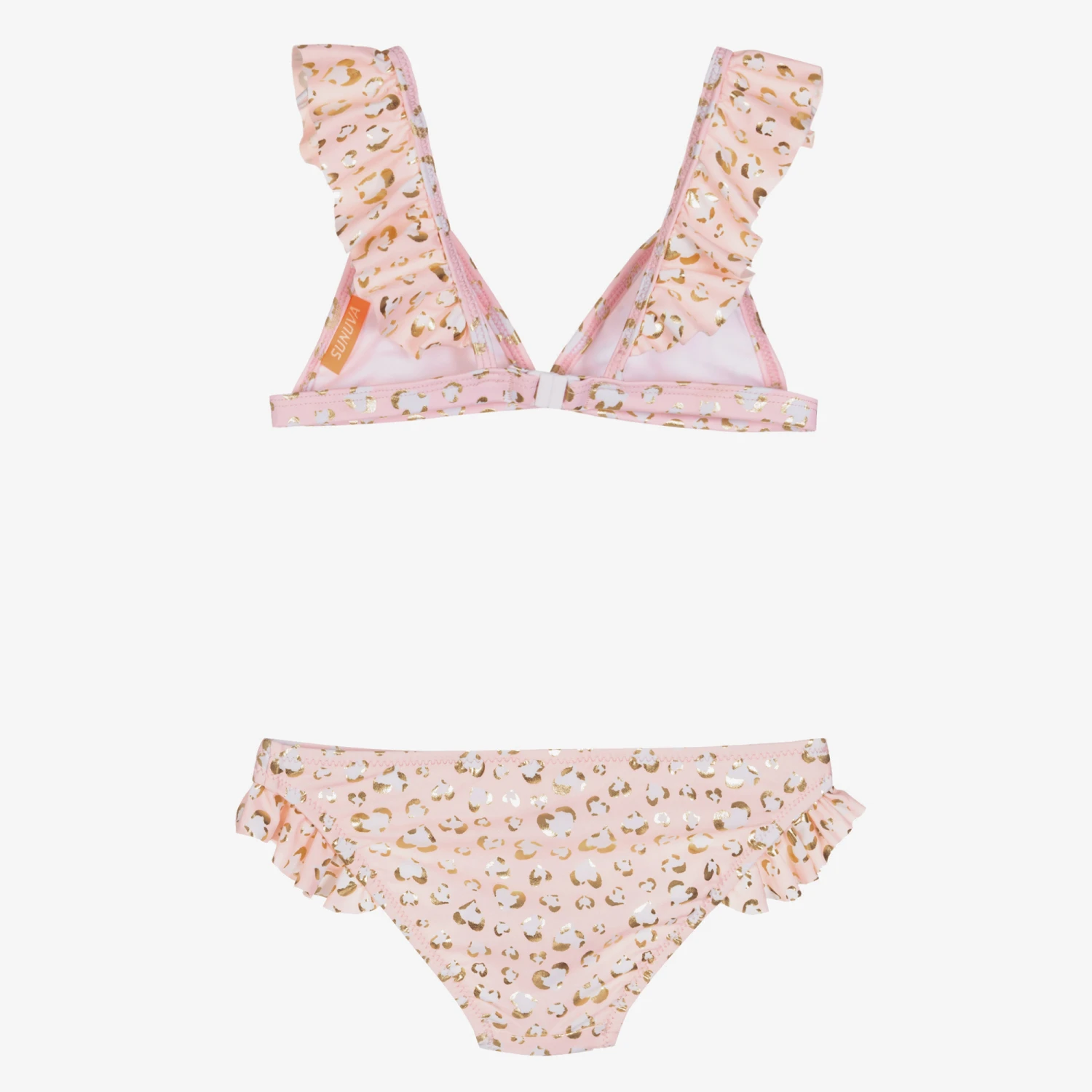 Lovely pale pink bikini for girls by Sunuva. Made in silky lycra lining, it has a pink leopard print design all-over with pretty gold foil details and ruffle trims.