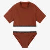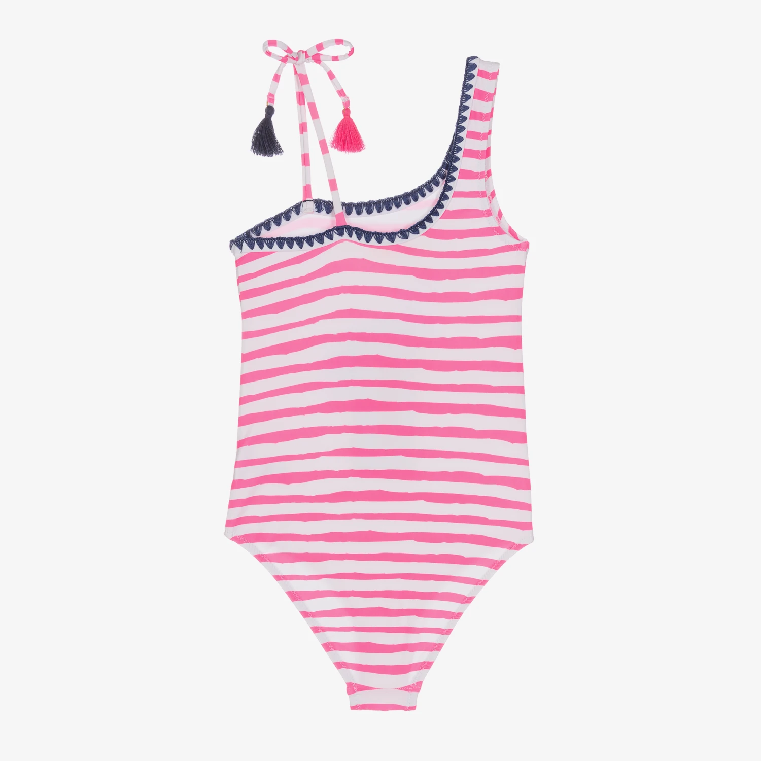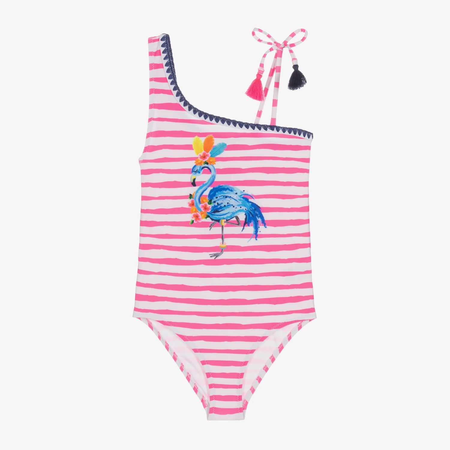 In pink and white stripes, this fun swimsuit for girls is from Sunuva. It is made from a smooth and stretchy recycled fabric, with a fully breathable lining for comfort. A tropical flamingo is printed on the front, and there are navy blue stitched trims decorating the asymmetric neckline. There is a thin shoulder strap with navy blue and pink tassels, offering supportive yet stylish wear.