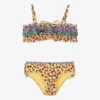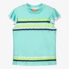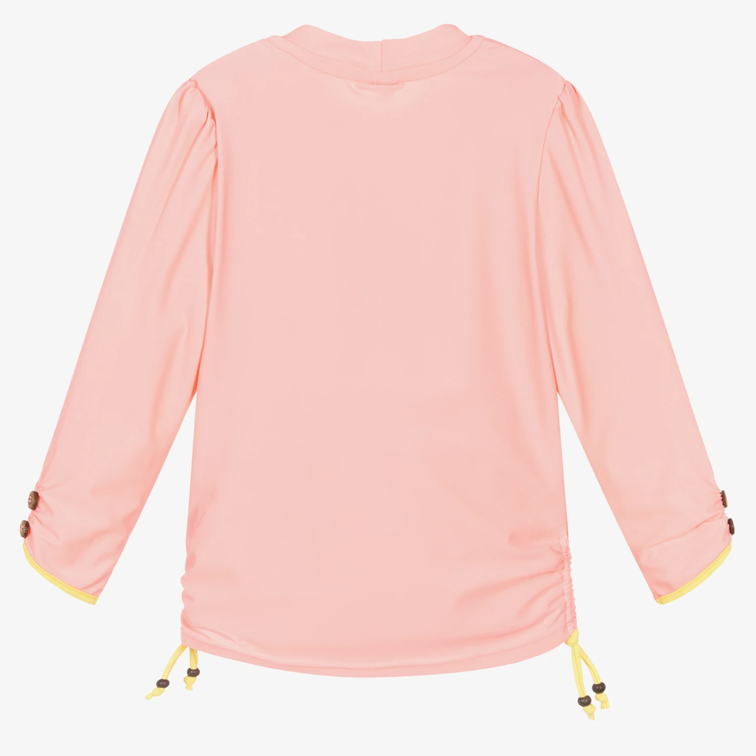 Pink swim top for girls by British swimwear brand Sunuva, for days by the beach or pool. Made in recycled, silky, sun protective jersey, it has ‘sun shine’ printed on the front in neon yellow, green and white, with coordinating tassels below. The sleeves and side seams have stylish gathered detailing with neon yellow trims.
