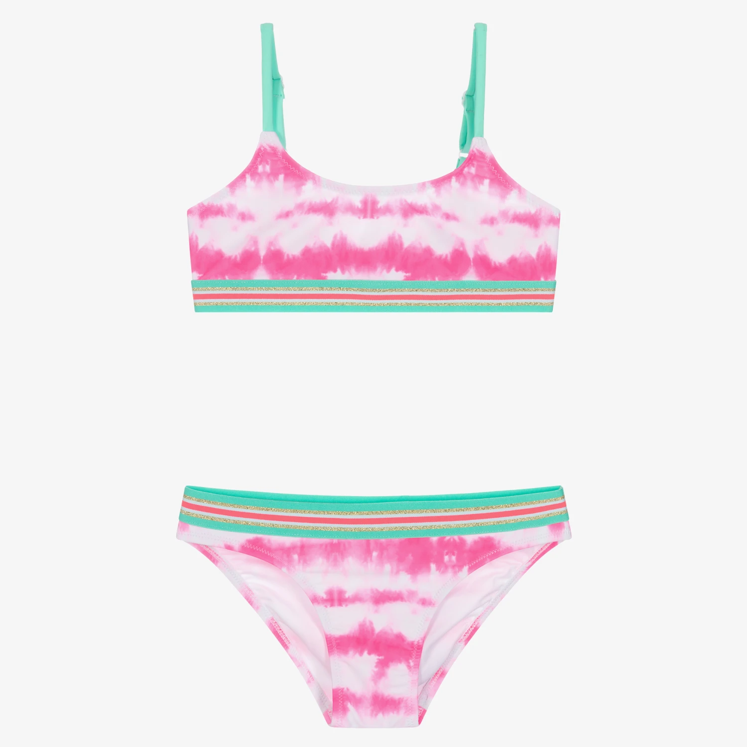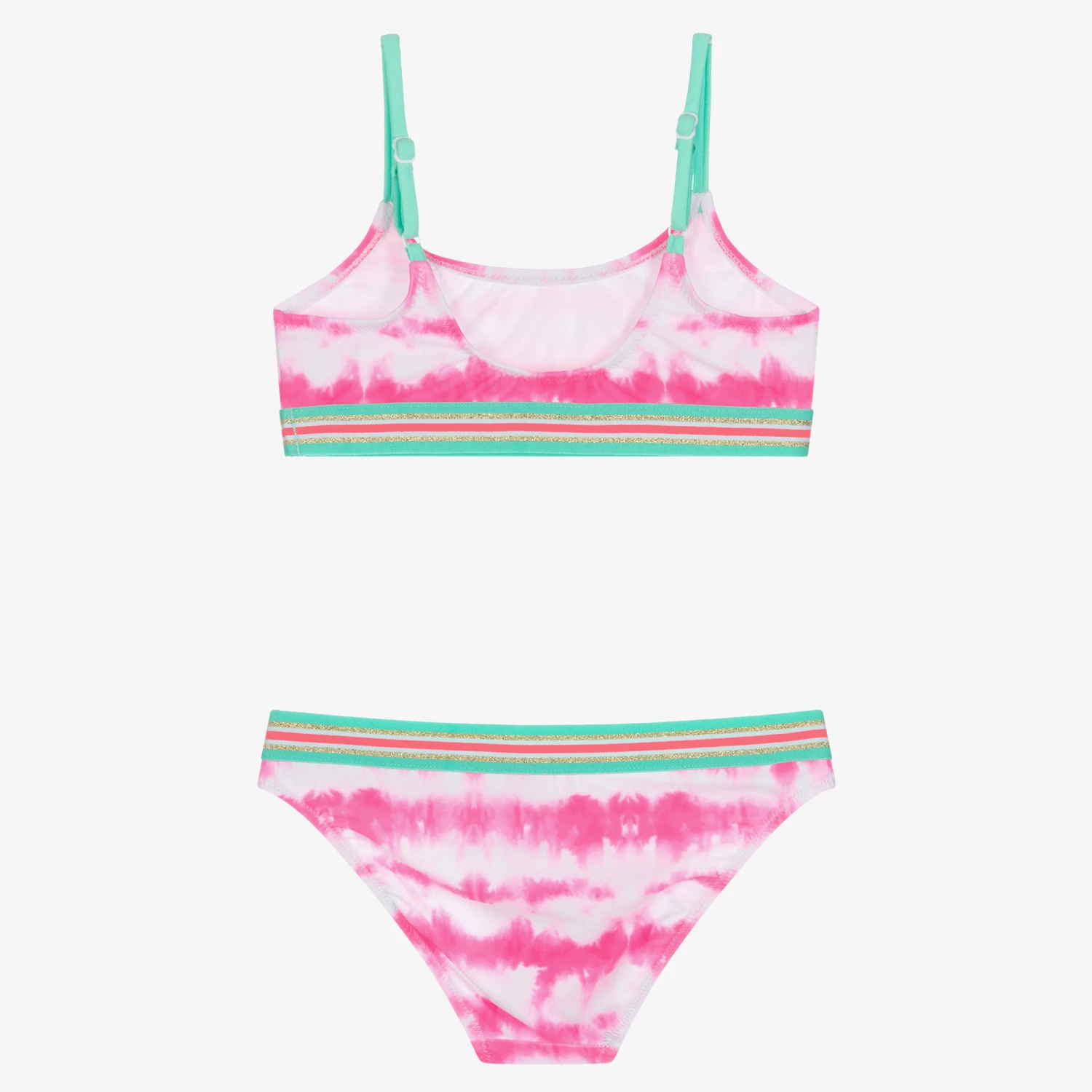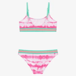 Fun pink and white tie-dye bikini for girls by British swimwear brand Sunuva, with green, pink and glittery gold trims. Ideal for the beach or poolside, it is made in soft, silky, recycled fabric offering stylish sun protection and is fully lined for comfort. The straps on the top are adjustable for a good fit.