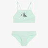Girls white bikini by Sunuva, with a yellow Sicilian lemon print, made in a silky-soft fabric, with UPF50+ sun protection. It has a soft jersey lining, fastens with a clasp at the back of the top, and has pretty ruffle trim.