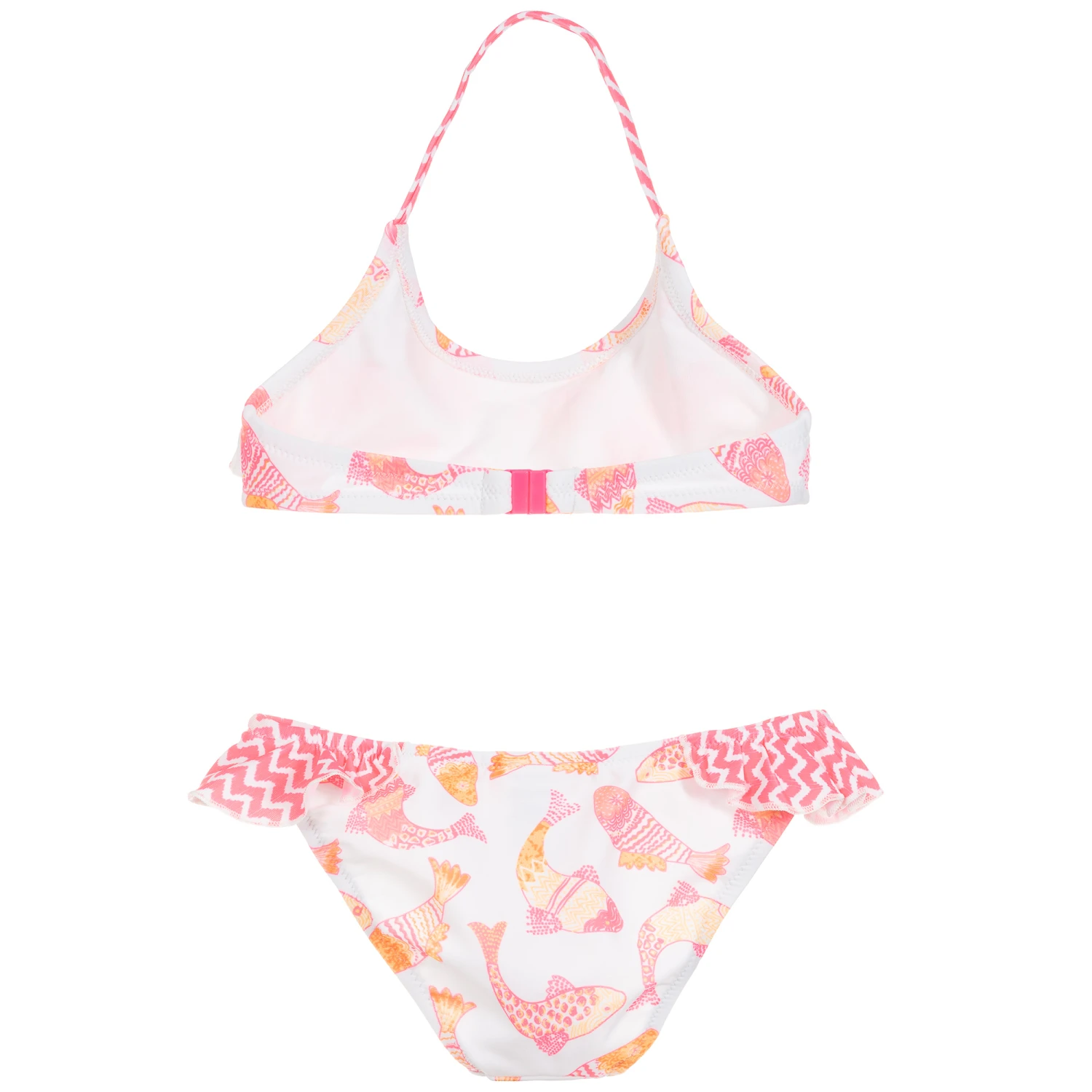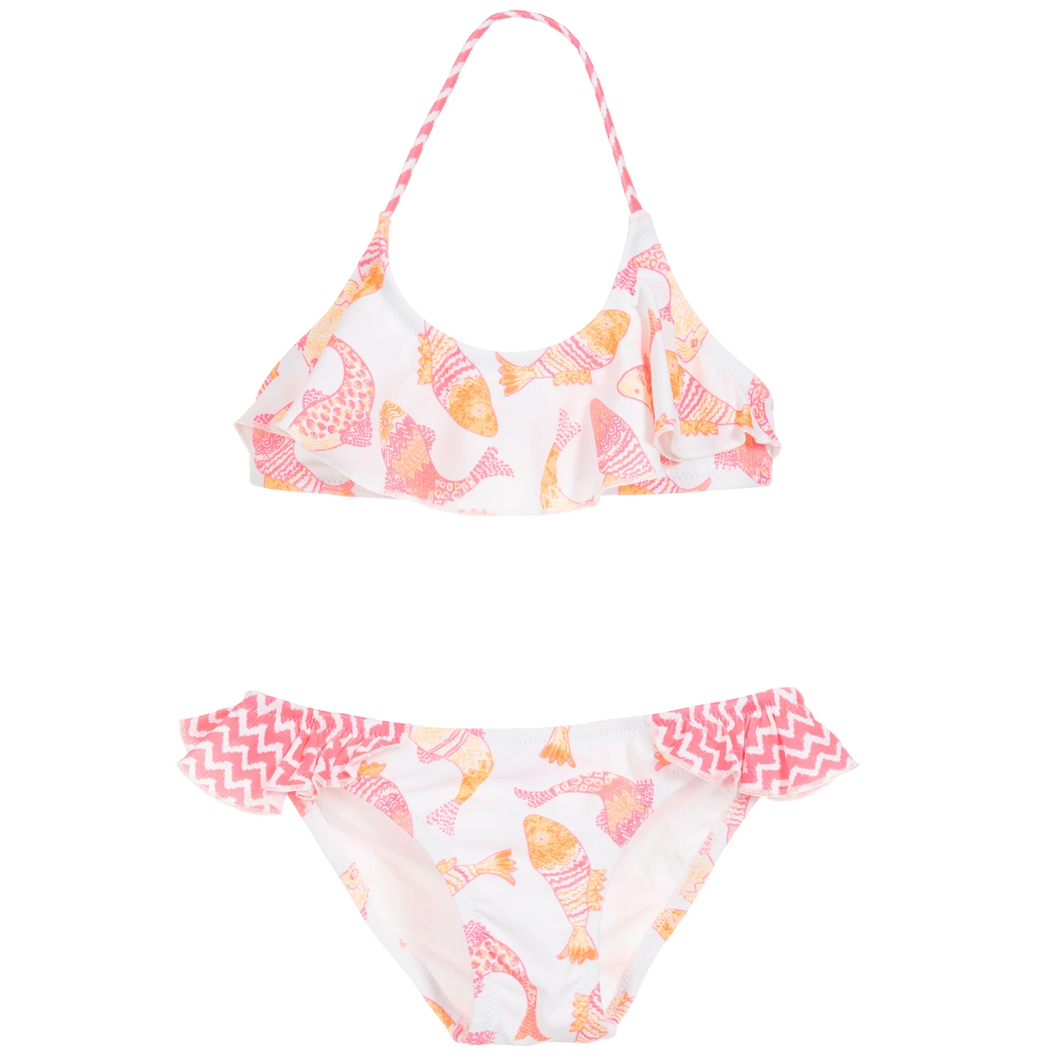 Girls white bikini with a neon pink and orange fish print by Sunuva. Silky smooth and stretchy, with UPF50+ sun protection, this fully lined bikini has a halter neck and pretty frilled details.