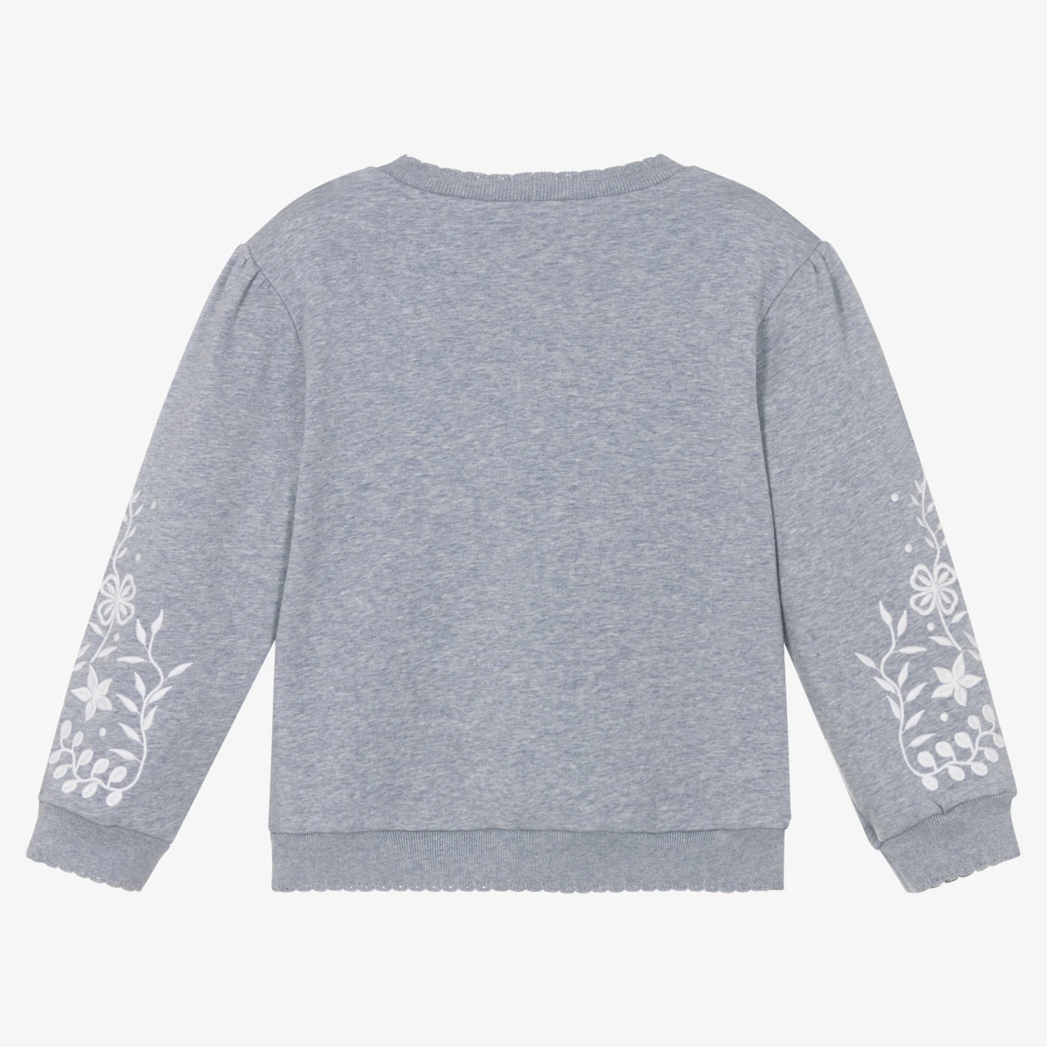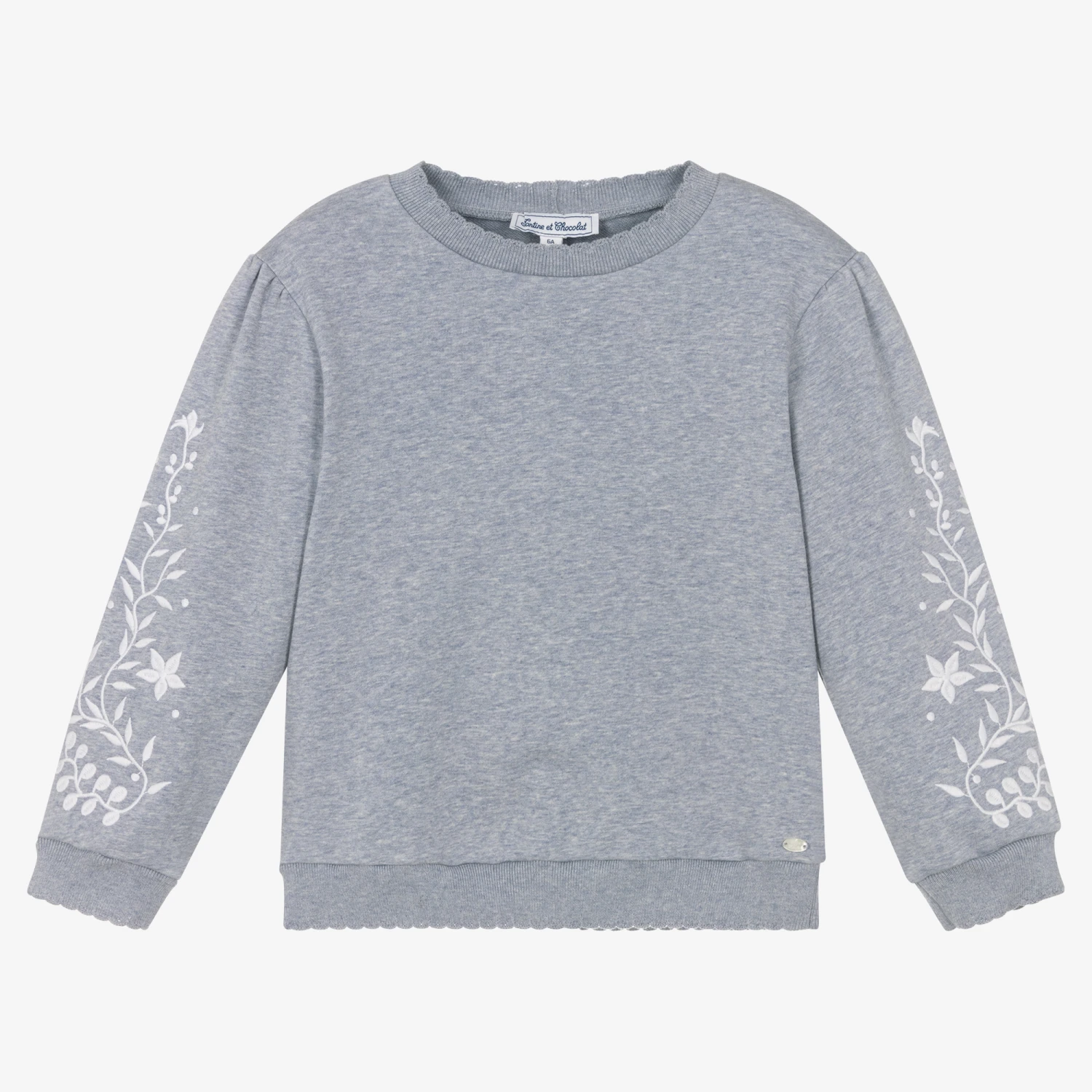 Comfortable blue marl jersey sweatshirt for girls from Tartine et Chocolat. This wardrobe staple is refined with puffed sleeves, dainty scalloped trim on the neckline and hem, along with pretty floral embroidery on the sleeves.