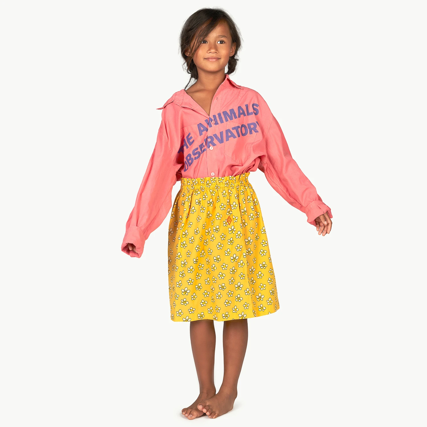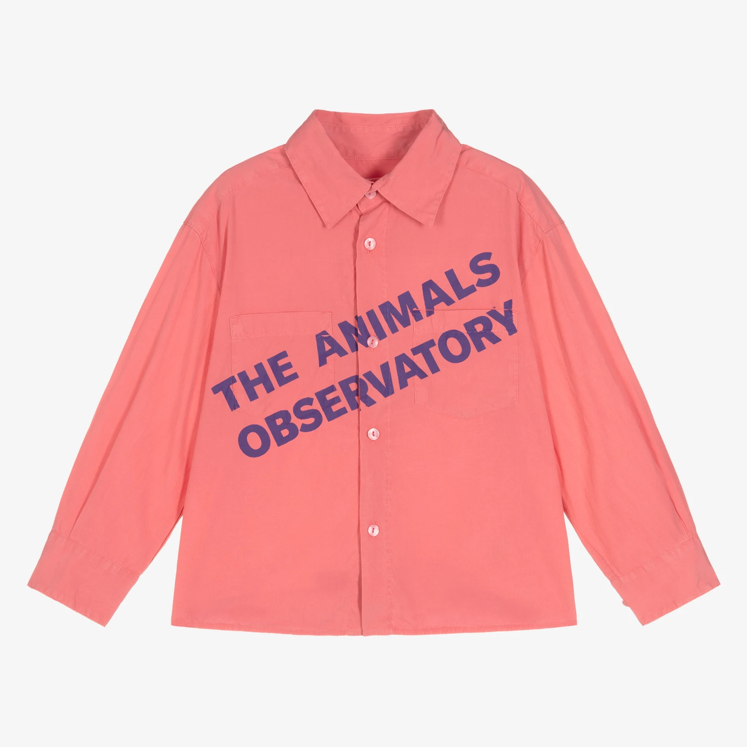 Bright pink shirt for boys and girls by The Animals Observatory, in a cool oversized fit. Made in eco-conscious Tencel™, this statement shirt has a bold purple logo print across the front, and a pointed collar for a smart-casual look.