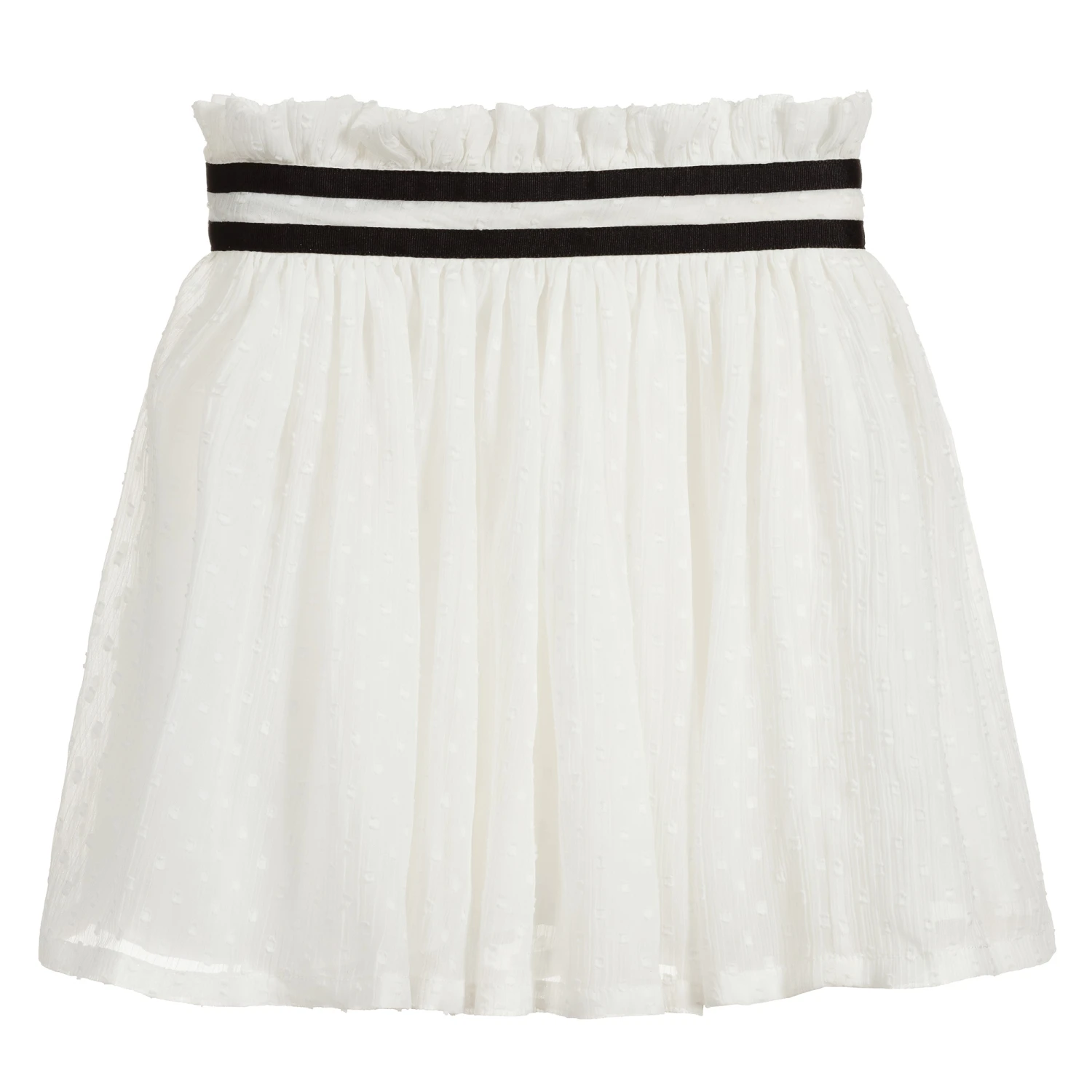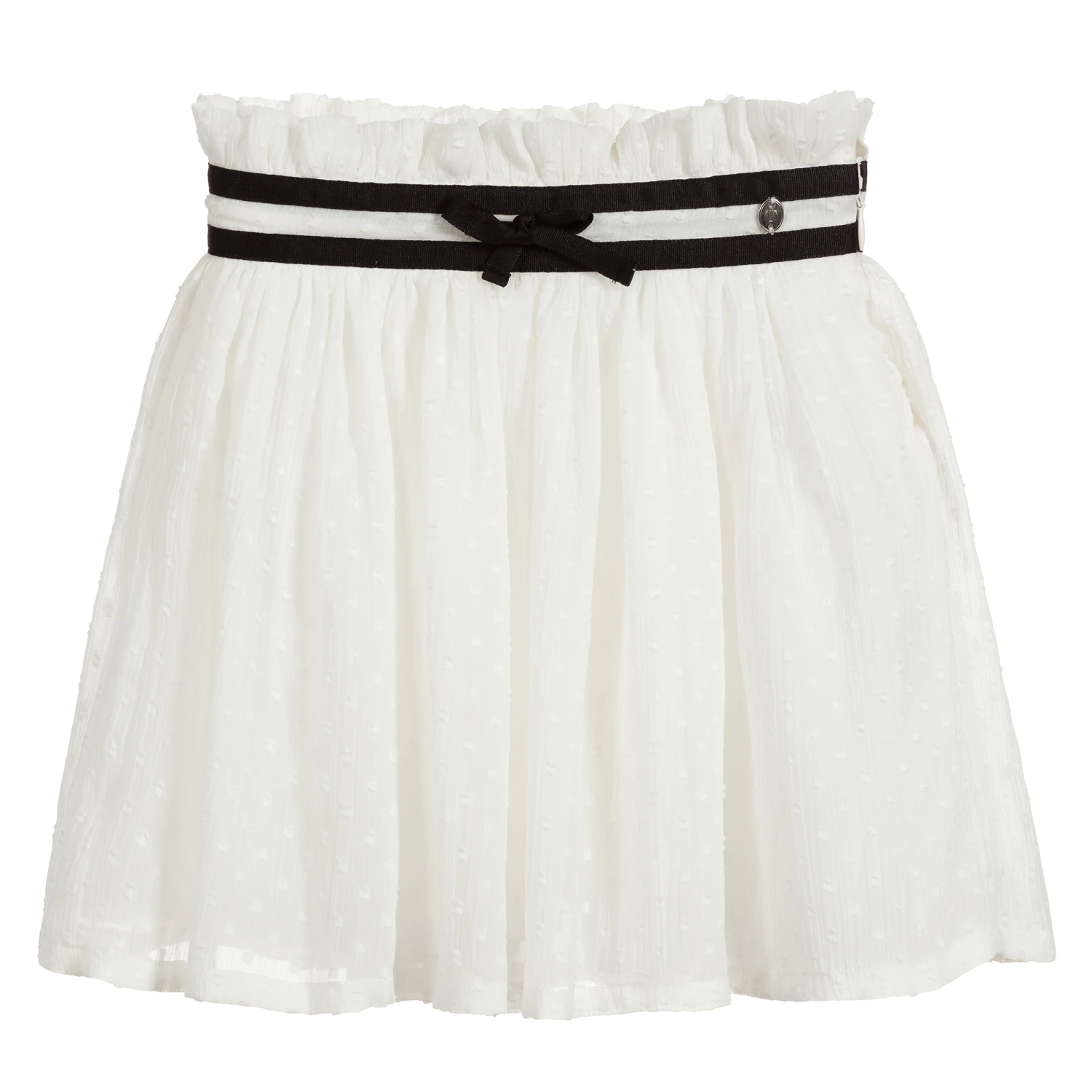 Girls pretty white skirt with black grosgrain ribbon trim from Trussardi. Made in soft chiffon layers with plumeti tufts, and a soft viscose lining. It has a zip fastening on one side.