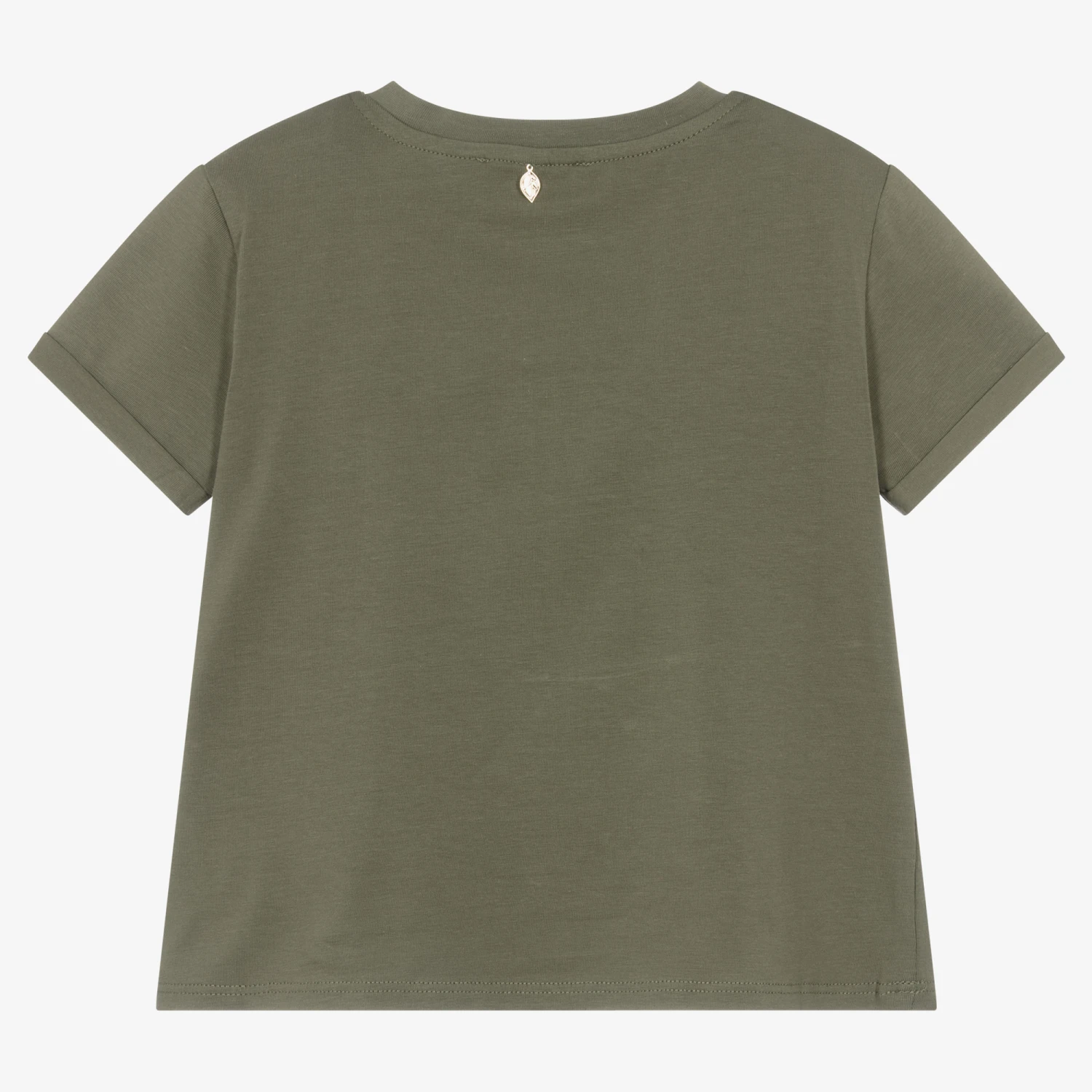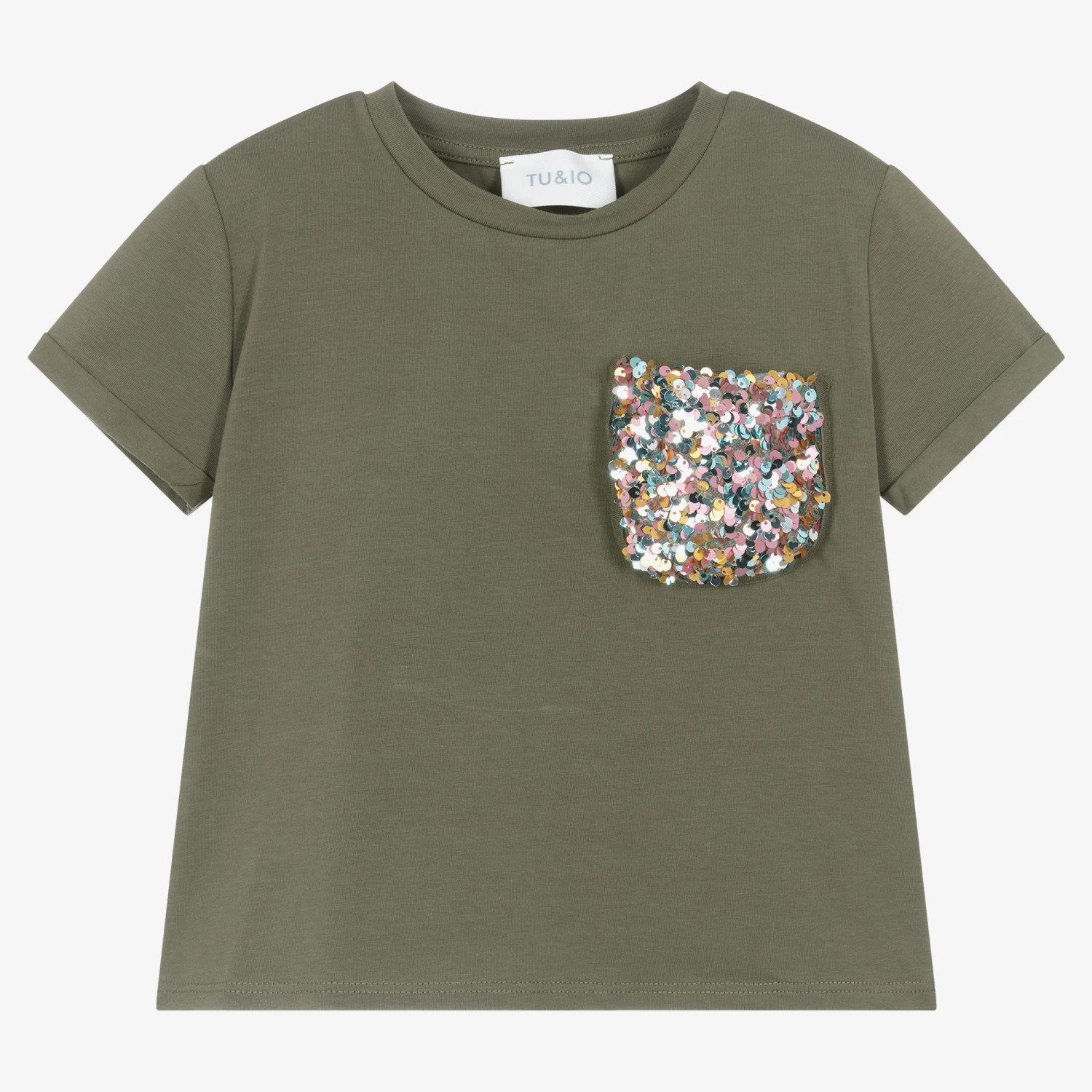 Eye-catching khaki green cotton T-shirt for girls from Tu & Io by Naturino, with shimmering pink, yellow and blue sequins on the front patch pocket. Ideal for a little sparkle on relaxed days, it is made in comfortable jersey with cute, turned-up cuffs.