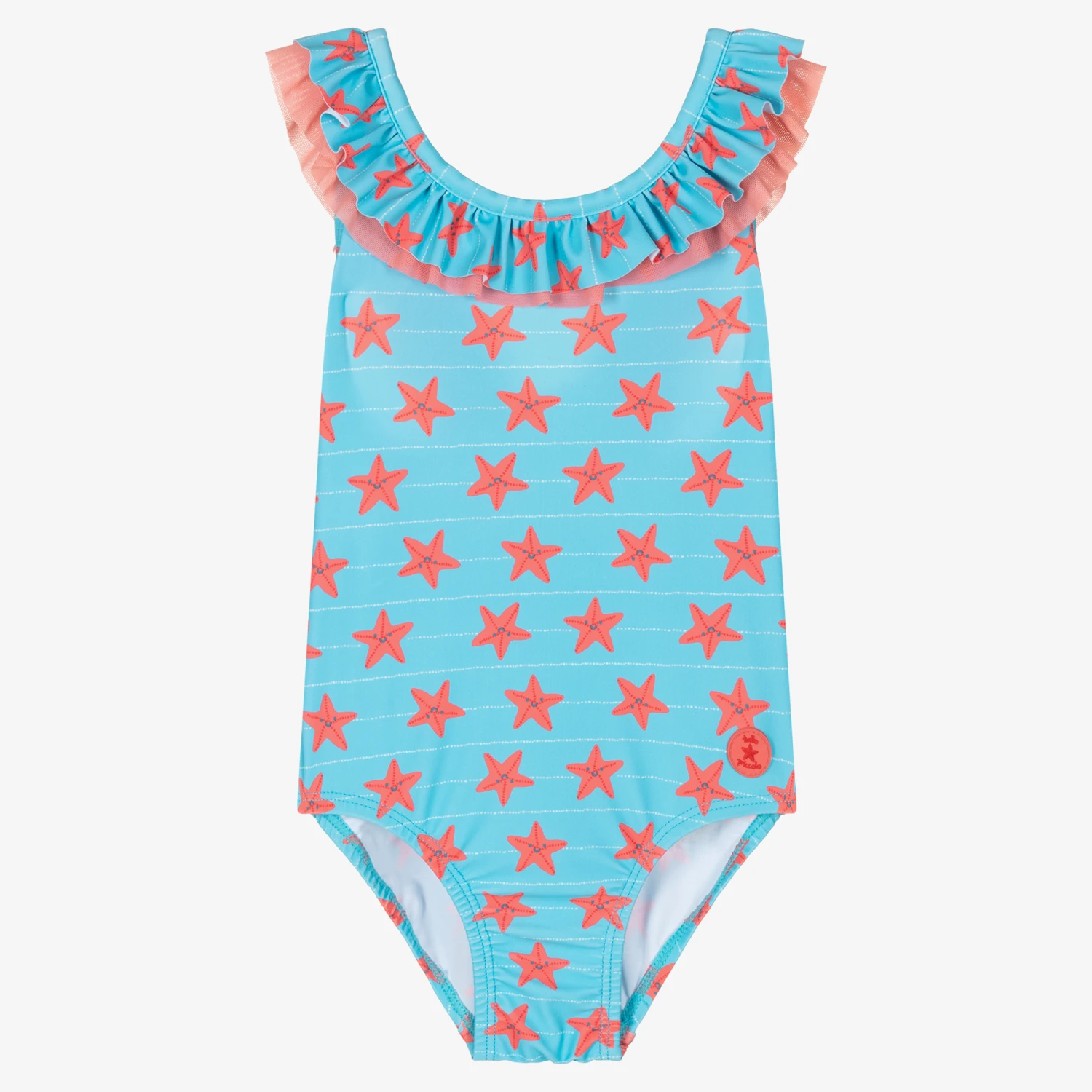 Playful blue swimsuit for girls by Spanish brand Tutto Piccolo, with a happy starfish and stripe print. Soft and smooth, it has a ruffled trim with an orange tulle layer, and a rubberised logo on the front.