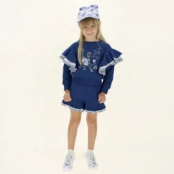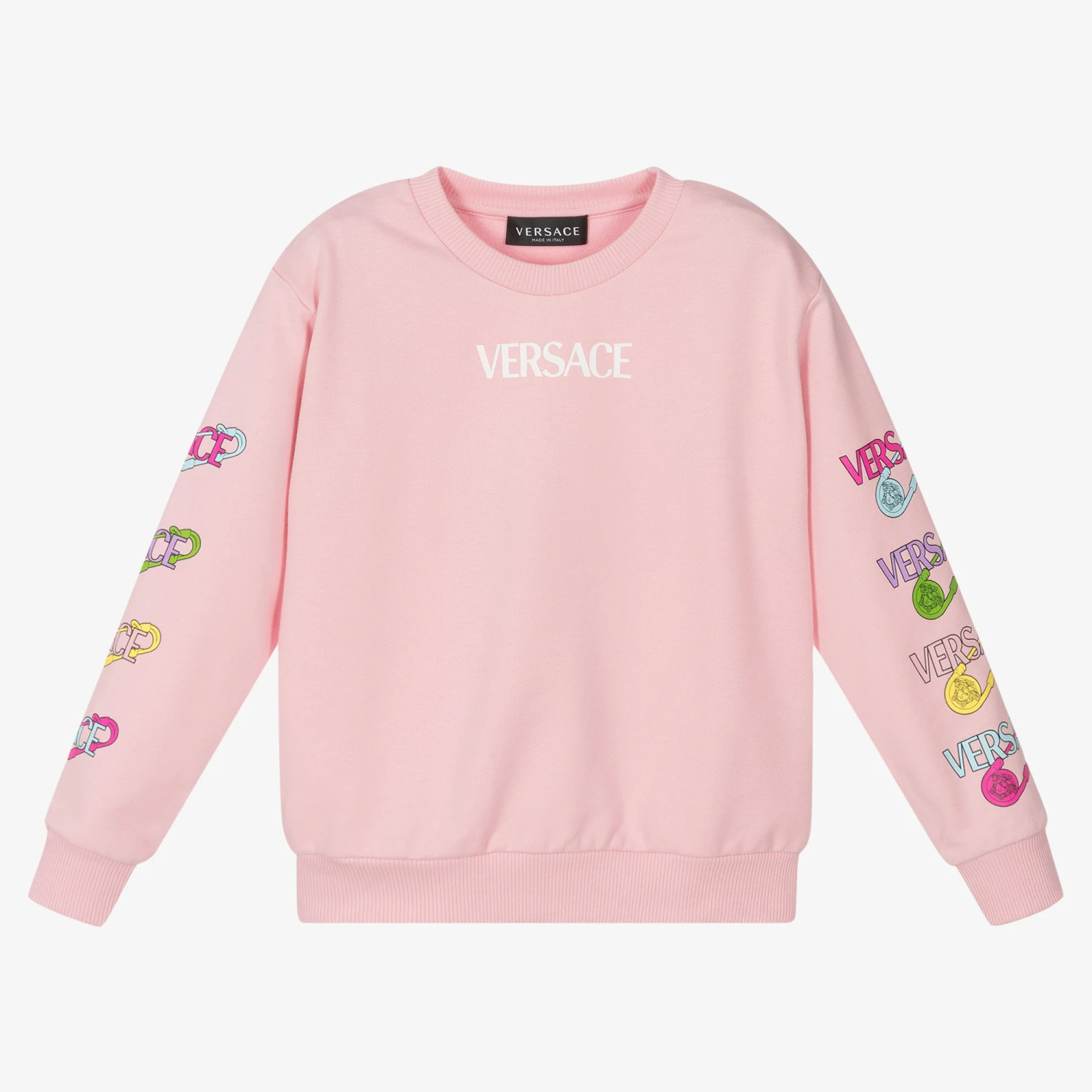 Pale pink sweatshirt for girls by luxury Italian designer Versace. Made in cotton sweatshirt jersey, the front has a black logo print on the front. There is a colourful print of safety pins detailed with the brand’s iconic Medusa down both arms. It is finished with ribbed trims.