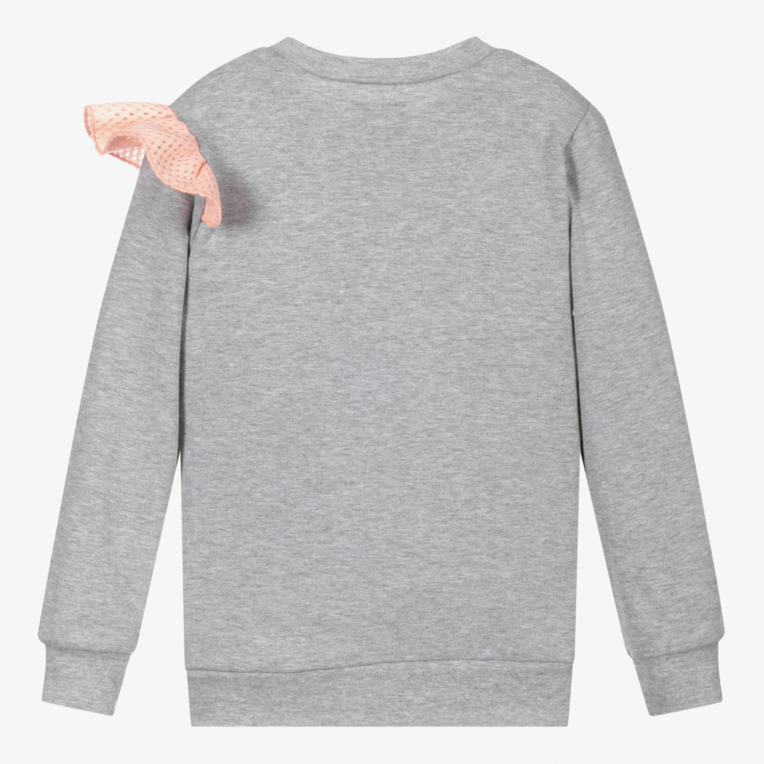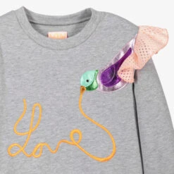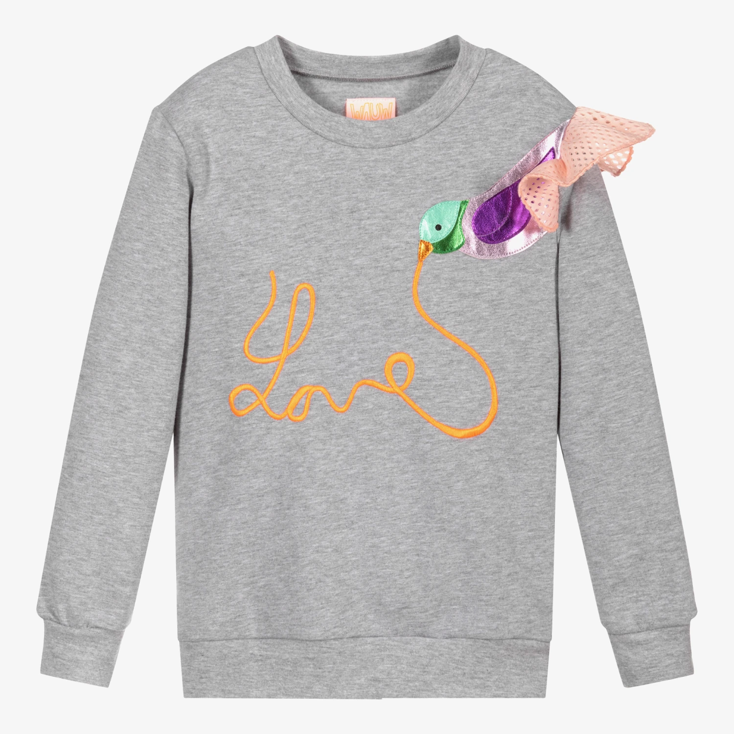 Girls grey sweatshirt by Wauw Capow by Bangbang. Made from soft organic cotton jersey, it has ‘love’ embroidered in neon orange on the front, and a purple and green metallic bird with a sweet pink mesh feature on the shoulder.