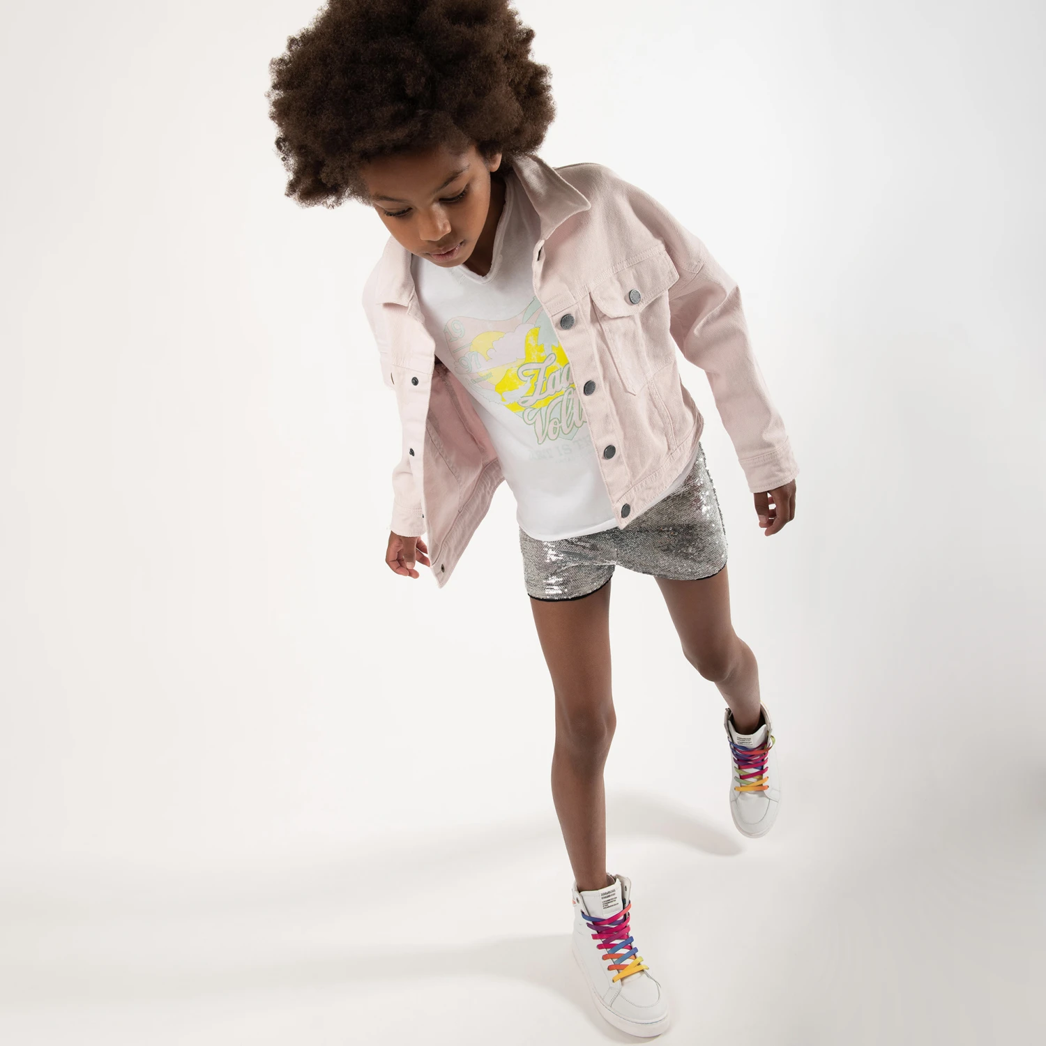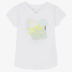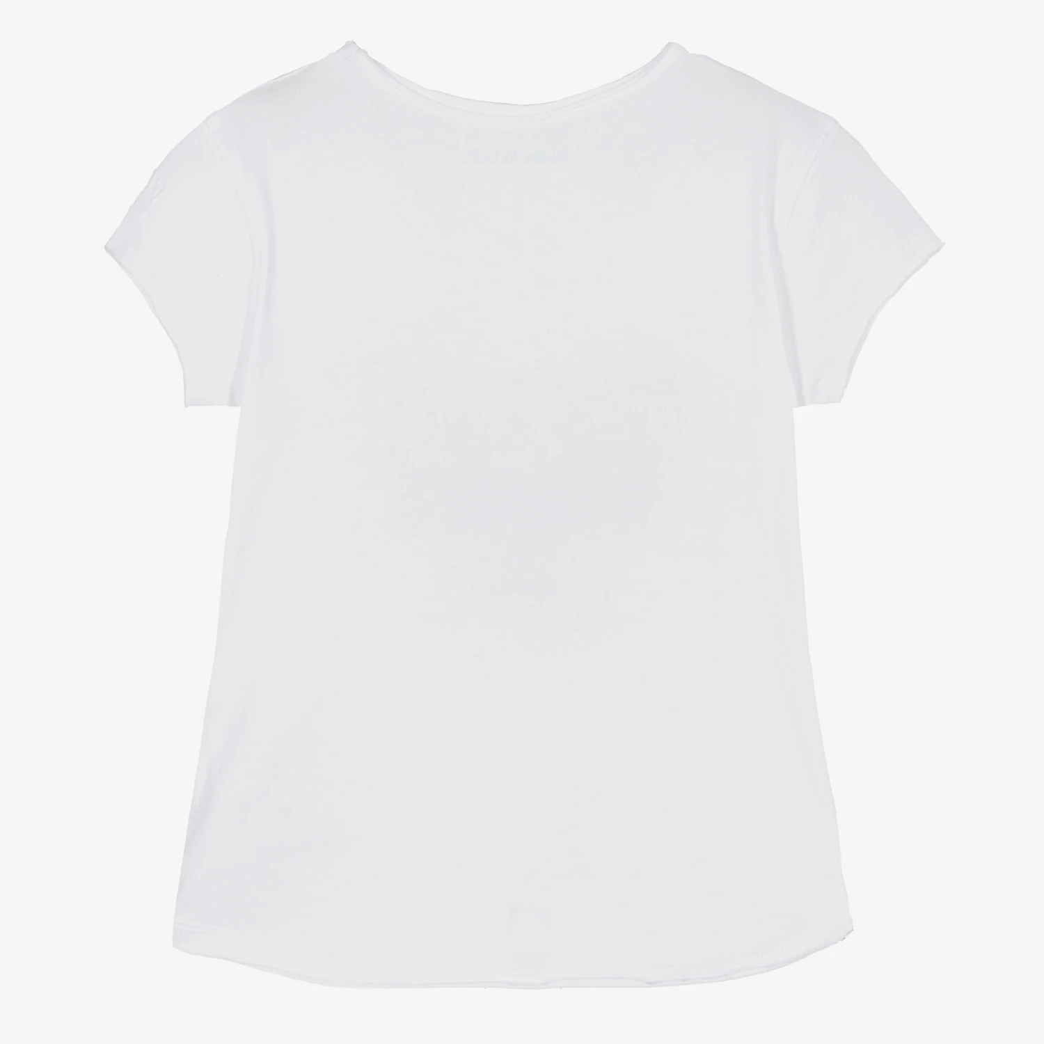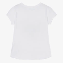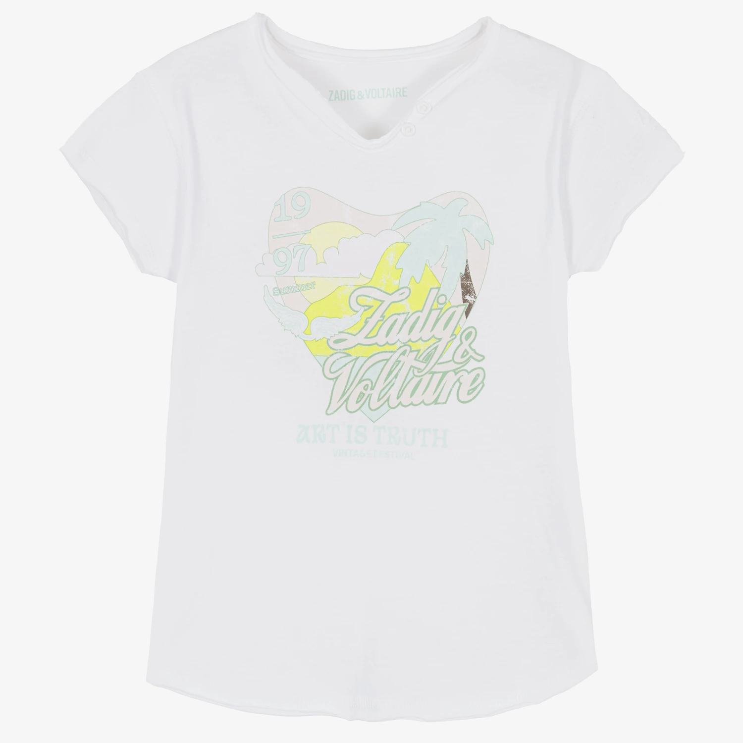 Casual white T-shirt for girls by Zadig&Voltaire, made in soft cotton jersey. With a paradise beach-inspired graphic on the front, it has the brand’s signature Henley neckline with two buttons and raw edged seams. Inspired by the adult collection, it has a logo print on the front and a subtle white logo embroidered on one sleeve.