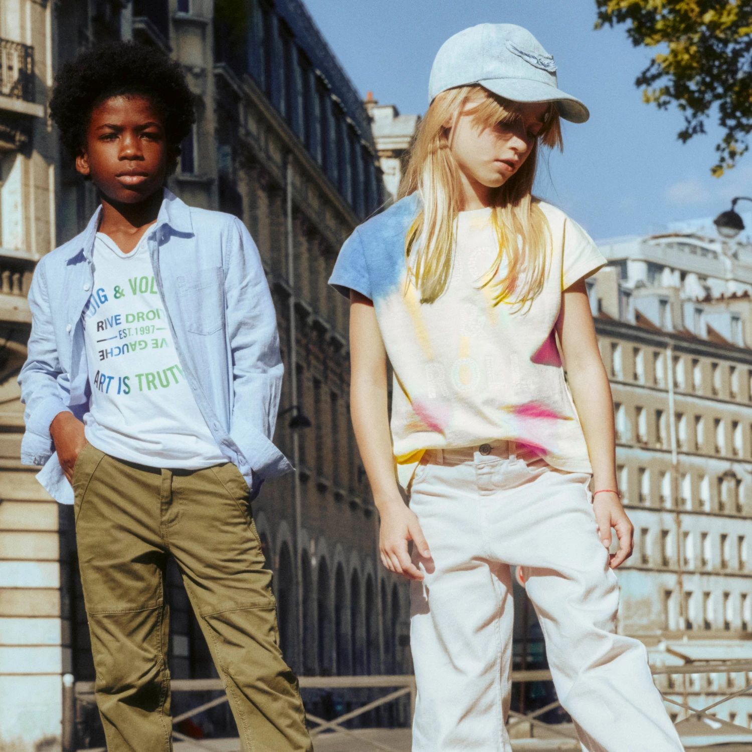 Yellow T-shirt for girls by French brand Zadig&Voltaire, made in soft organic cotton jersey. Inspired by the adult collection, this boxy-shaped tee is designed in a blue, yellow and pink tie-dye print with a distressed ‘Rock & Roll’ slogan on the front. Cool and casual, it has dropped sleeves and a ribbed crew neck.