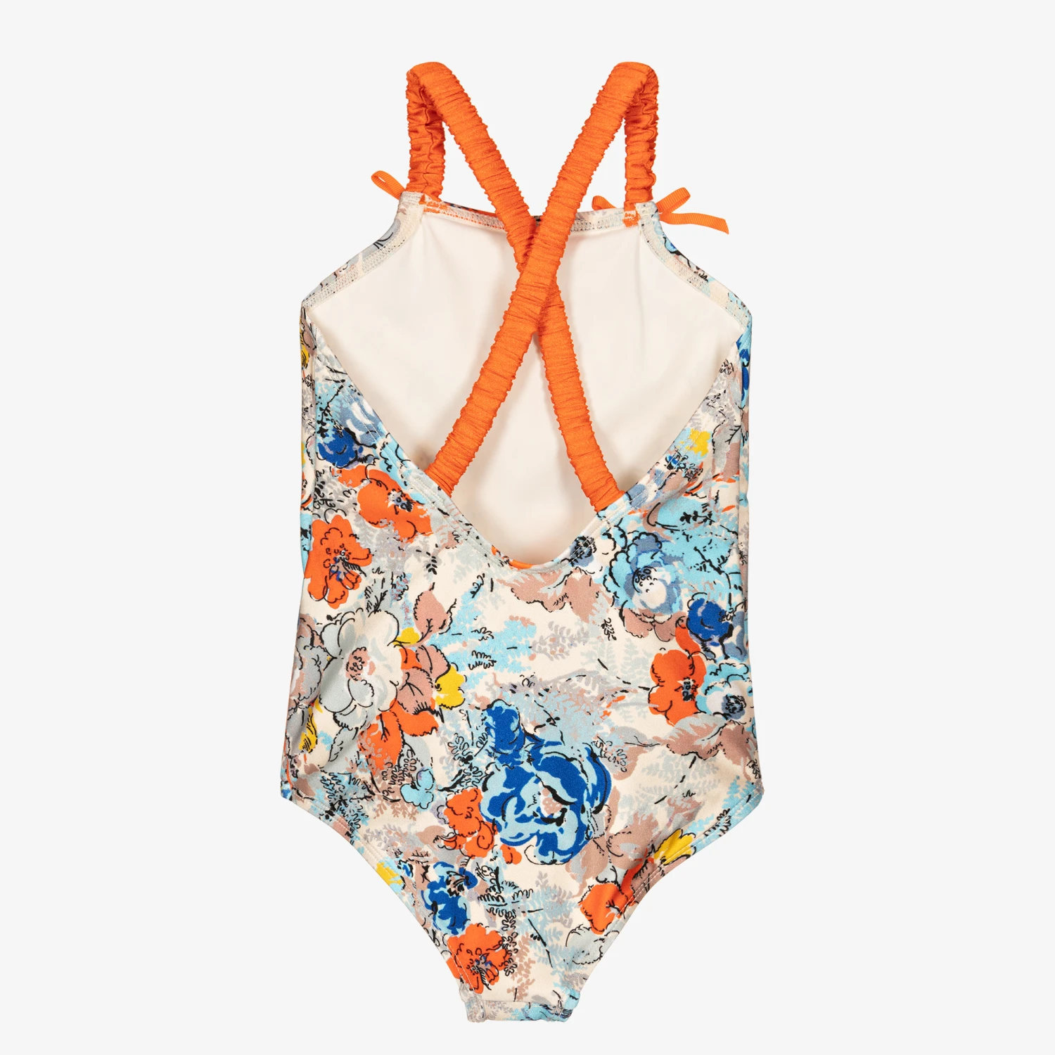 Girls blue and orange Peony Floral swimsuit, designed by Australian brand Zimmermann. Silky and stretchy with a lightweight lining, it has contrast orange straps which are ruched and fully elasticated for extra comfort.
